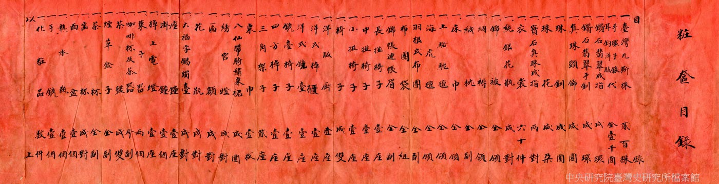 本件是日治時期汐止陳定國家族成員嫁妝目錄。陳家為汐止地區的重要家族,由嫁女粧奩可以看出家境的富裕。目錄中羅列嫁女準備的嫁妝,如臺灣瓦斯株(股票)200股、家具、寢具、燈具、化妝品、珠寶翠飾、衣著等。其中,臺灣瓦斯會社(1934年創立)股票,1股25圓,200股共5,000圓。以當時高所得的醫師收入對照,1930年代醫師每月平均收入約300圓,5,000圓約是醫生17個月的收入。