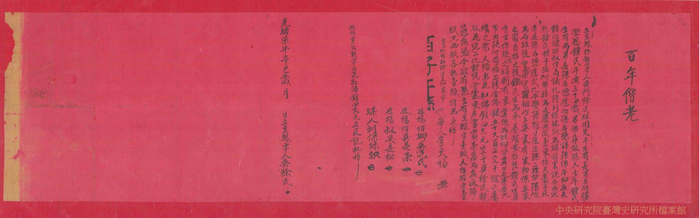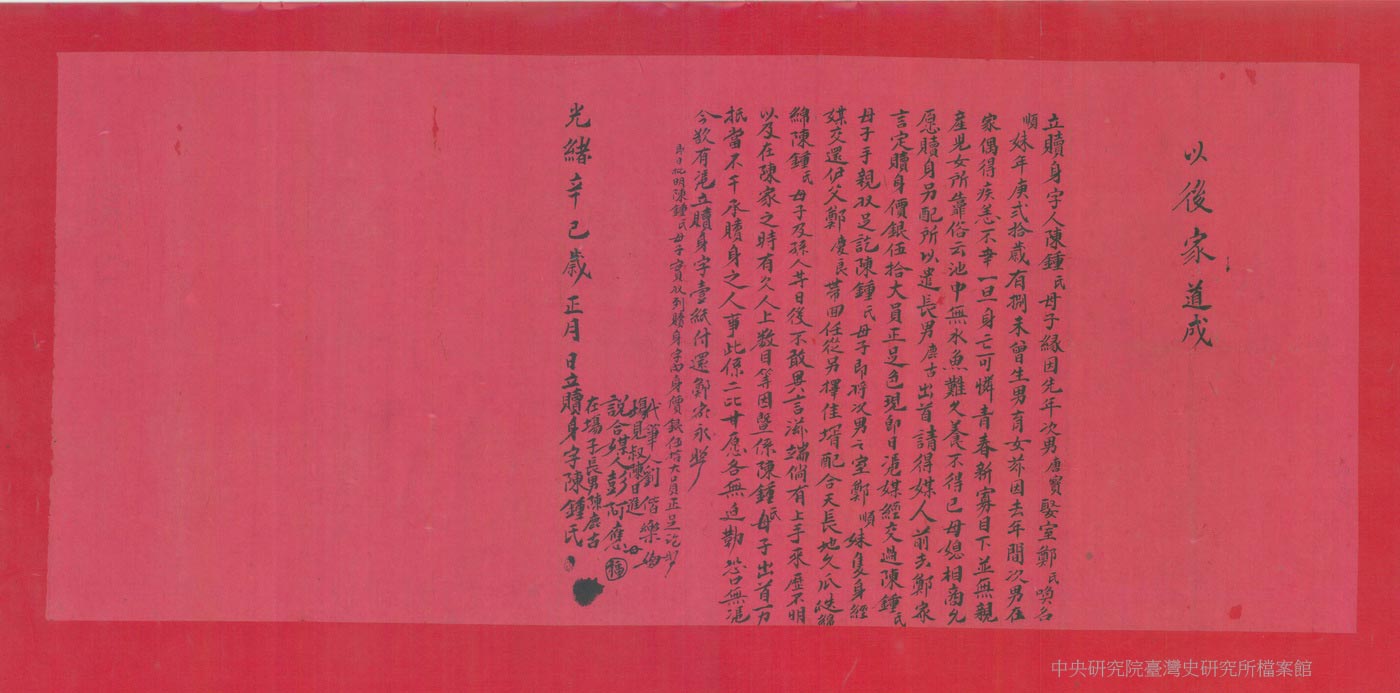 婆婆陳鍾氏於次子患病過世後,在「母媳相商」後作主,於光緒7年(1881)1月立契,由次媳鄭順妹的父親鄭慶良以「贖身銀」50大員為代價,贖回女兒的人身自由。