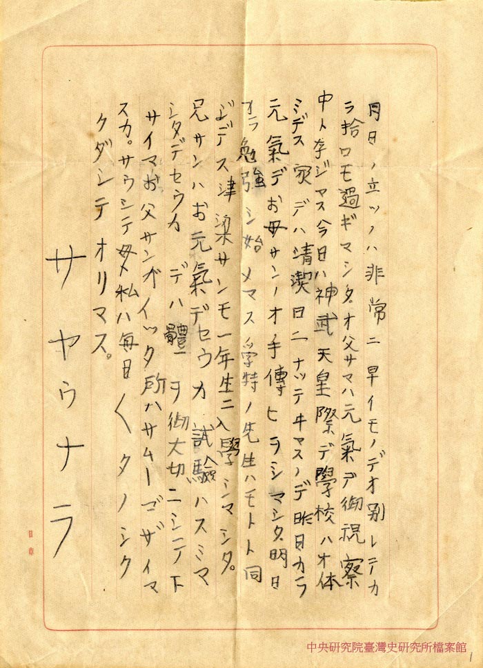 1941年4月,臺南善化的孫江淮赴日探視長子及梯留學期間,幼女孫鶯(此時10歲)寫信給父親報告家裡的情況,以及堂弟津梁(此時7歲)就讀公學校一年級的訊息。