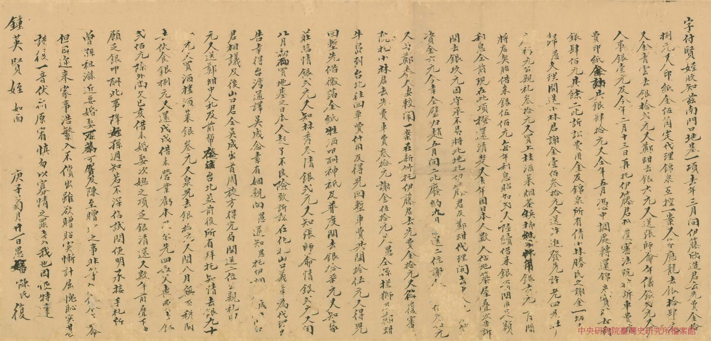 庚子(1900)菊月(農曆9月)21日,郊商周茶春號成員陳氏告知鍾英,經手與管理的費用開銷。開支項目,除了雇用伊藤欣造代理錦泉互控一案、日人佔地築屋告訴等土地訴訟費用外,還包含借貸、祭祀、婚喪、車資等家用與營業支出。