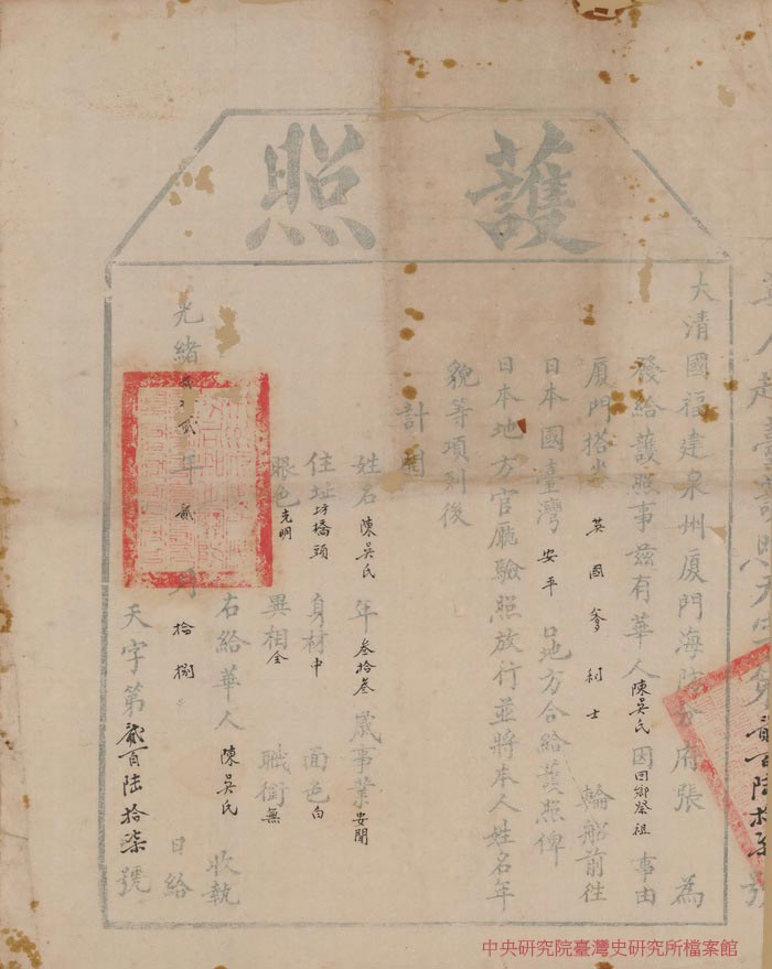 光緒22年(1896)2月18日,陳吳氏回鄉祭祖,從廈門搭乘英國爹利士輪船前來臺灣安平,持此護照作為臺灣地方官廳驗照放行的憑據。陳家先祖於清同治年間,由福建泉州府移民來臺,定居於枋橋頭(今臺南市)。開基祖陳錦雲經營文峰茶莊,初創業時經常往返廈門採辦貨物,陳吳氏則為第二代陳登志的眷屬。